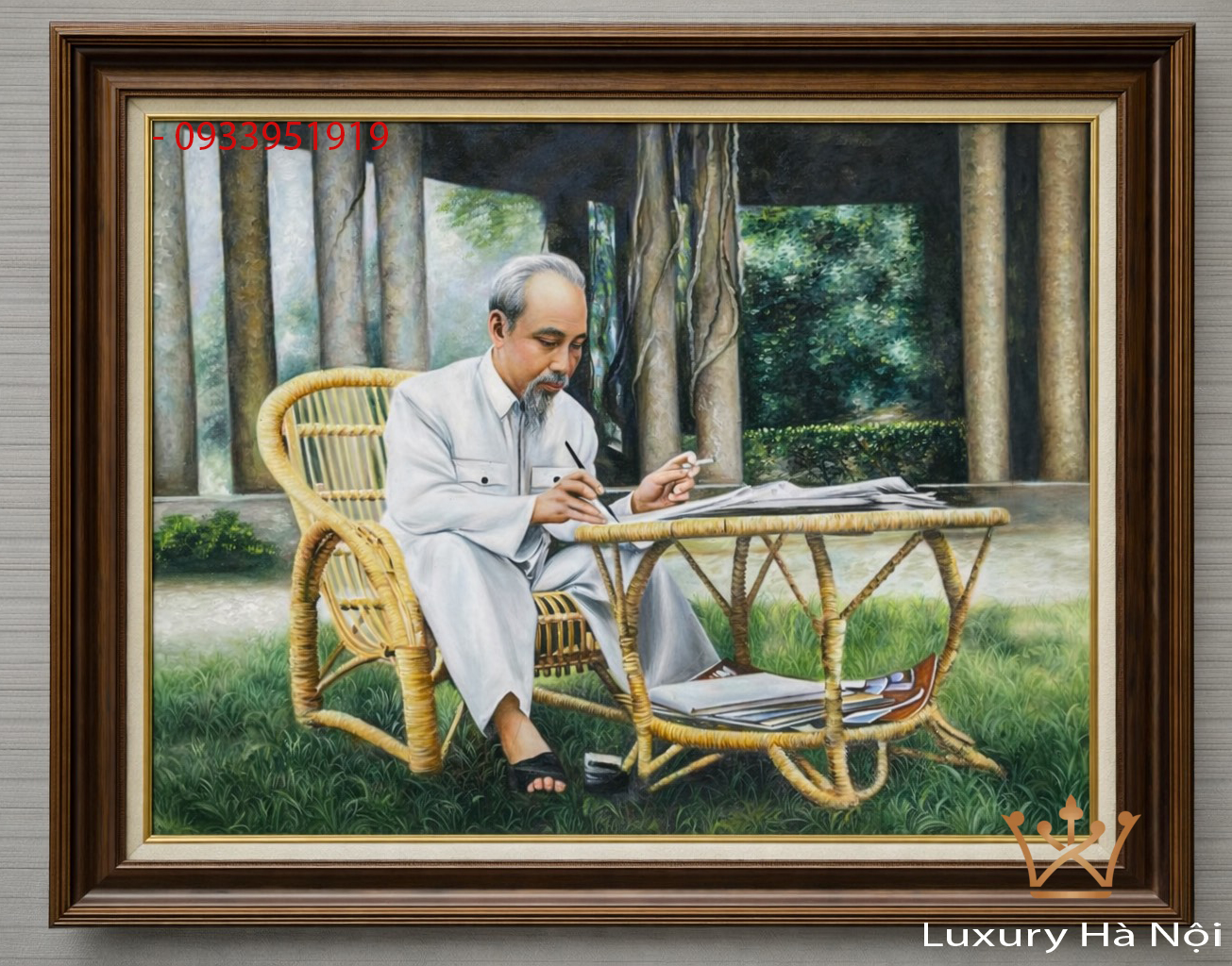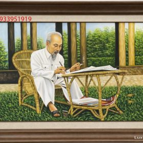 Tranh Bác Hồ ngồi làm việc là một trong những hình ảnh chân dung thiêng liêng và giàu ý nghĩa nhất, khắc họa trọn vẹn phong thái ung dung, trí tuệ uyên thâm và đức hy sinh trọn đời vì dân tộc của Chủ tịch Hồ Chí Minh. Không ồn ào, không khoa trương, bức tranh toát lên vẻ đẹp bình dị mà vĩ đại – đúng như con người và nhân cách của Người.