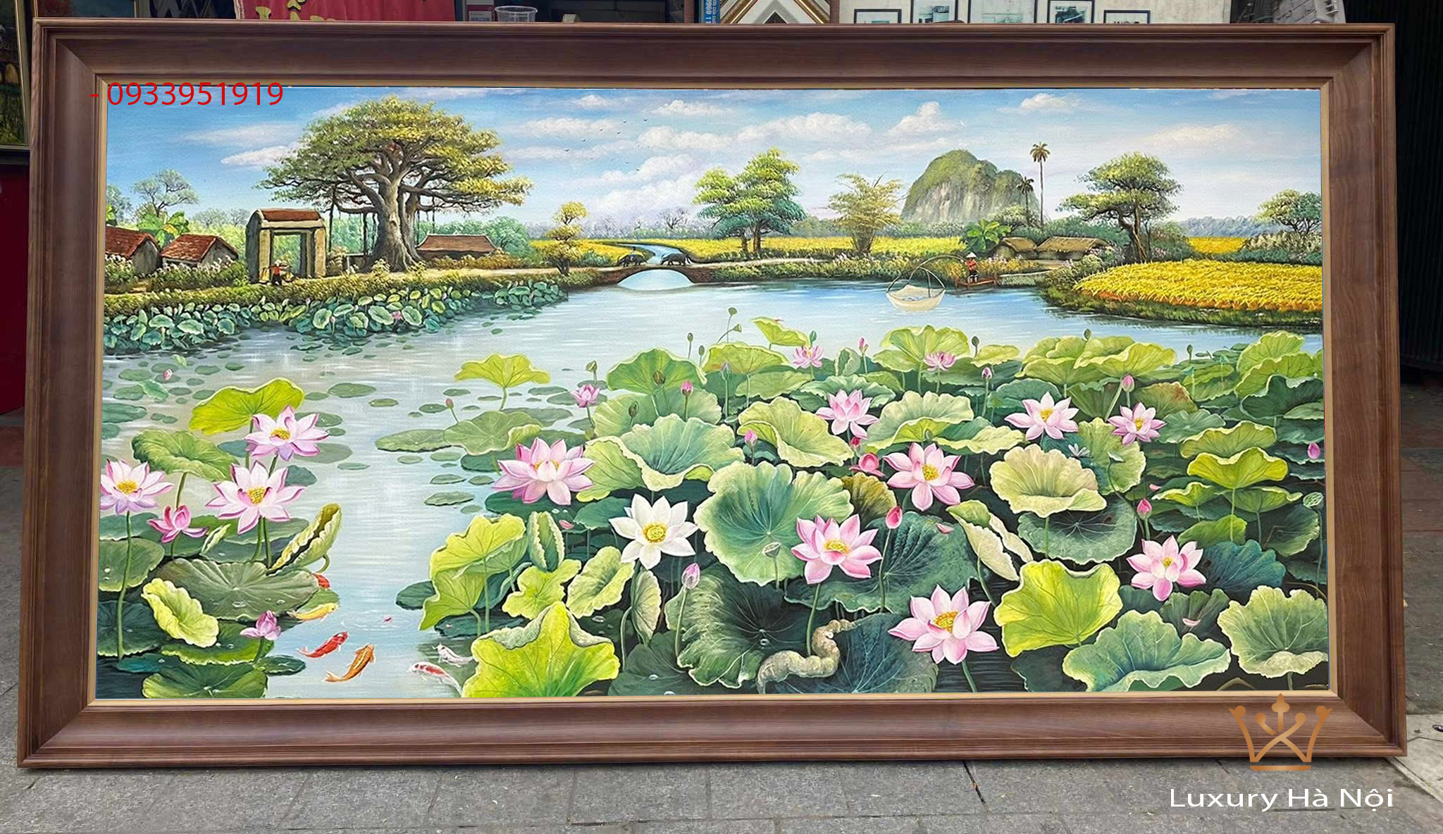 Tranh hoa sen mộc mạc của làng quê Việt treo tường là một tác phẩm giàu cảm xúc, lấy vẻ đẹp bình dị của làng quê Việt Nam làm chủ đề chính. Toàn bộ không gian tranh mở ra một khung cảnh yên ả, nơi đầm sen trải rộng giữa đồng quê thanh bình, gợi cảm giác gần gũi, thân thương và sâu lắng. Người xem như được trở về với những ký ức xưa, nơi thiên nhiên trong trẻo và cuộc sống trôi chậm rãi.