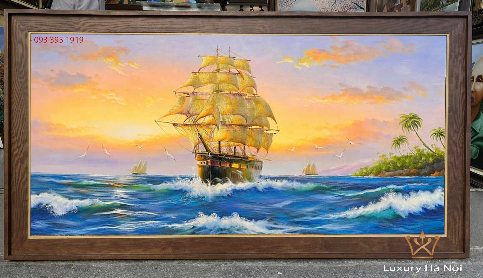 Tranh sơn dầu thuận buồm xuôi gió treo phòng khách giữa đại dương rộng lớn, con thuyền lớn hiện lên như một điểm nhấn đầy sức sống giữa không gian mênh mông không bờ bến. Không ồn ào, không phô trương, con thuyền lặng lẽ nhưng dứt khoát tiến về phía trước, mang theo hơi thở của khát vọng, của niềm tin và tinh thần không ngừng vươn xa.