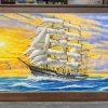 Bức tranh khắc họa hình ảnh con thuyền lớn đang rẽ sóng ra khơi. Con thuyền được vẽ với những đường nét khỏe khoắn, vững chãi, thể hiện sự kiên cường và bền bỉ. Những cánh buồm căng phồng trong gió, đón lấy luồng gió thuận lợi, tượng trưng cho sự hanh thông, phát triển và thành công trong công việc. Mặt biển xanh rộng mở trải dài đến tận chân trời, tạo cảm giác bao la, khoáng đạt, như mở ra những cơ hội mới cho tập thể và cá nhân đang làm việc trong căn phòng này.
