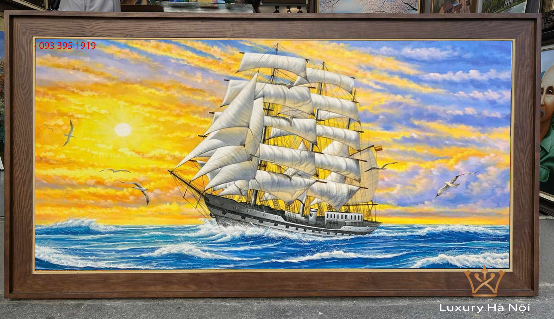 Tranh thuận buồm xuôi gió ý chí bền bỉ niềm tin vào tương lai rộng mở giữa không gian mênh mông của biển cả, con thuyền lớn hiện lên sừng sững và đầy uy nghi, mang theo vẻ đẹp vừa hùng vĩ vừa thơ mộng. Đó là hình ảnh con thuyền căng buồm no gió, đang mạnh mẽ vươn mình tiến về phía trước giữa đại dương bao la, gợi lên cảm giác về khát vọng chinh phục, ý chí bền bỉ và niềm tin vào tương lai rộng mở.